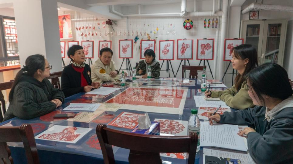 师生一行走进钢都花园123社区,在社区党委书记王俊的引导下参观非遗廉文化体验馆。馆内陈列的剪纸、皮影戏、漆扇及汉绣等作品,将廉洁教育与传统非遗文化巧妙融合。残障员工李诗谣通过“哪吒动漫”“廉政文化”等主题剪纸作品展现传统技艺的创新活力。座谈会上,双方就国际交流、志愿服务等议题展开讨论,提出依托公司的国际化教育资源,与社区联合打造“非遗廉文化+国际教育”特色课程体系,构建“数字赋能、文化传承、校社联动”的志愿服务新范式。