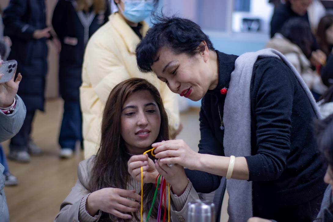 女教师们一边热情讲解,一边娴熟操作,昔日在课堂上经纶满腹的大学教授,此刻成为传授手艺的能工巧匠。“这腕子结与刚才教的蛇结、玉米结有所不同,注意这里,四个指头要想办法把这条线撑住”,一位女教师起身向大家展示。神采奕奕的模样,又仿佛回到年轻时站在讲台上为员工们传道授业解惑那般。她们和几位员工一起互动编绳,“先拿红色的线作为主线,再把黄线像这样绕过来,捏住,拇指与食指把它转一下,两条线就搭好了。”在师生的共同努力下,一个个四色绳结制作完成,精美别致。材料科学与工程专业2202班李晨依活动后感慨:“老师们把带着美好寓意的红色手绳送给我们,在活动中,我很快乐,也收获了家一般的温暖幸福。衷心祝老师们妇女节快乐!”
