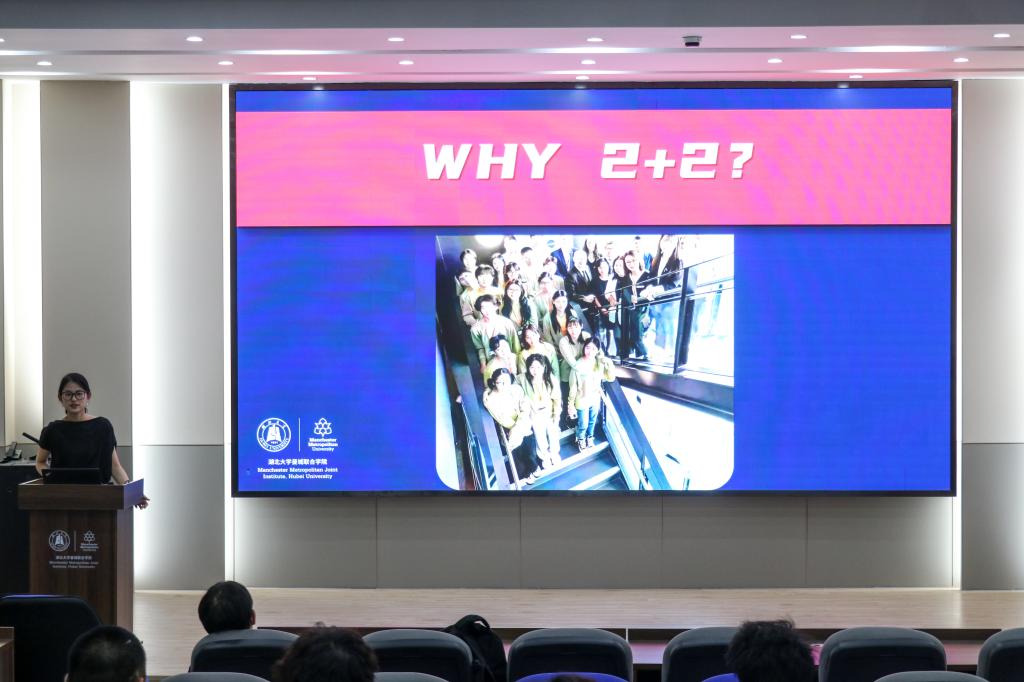 曾曦对留学曼彻斯特城市大学的基本情况、申请条件和教学资源进行了详细讲解。会上,她以“Why 2+2?”为主题,结合当前相关专业升学现状,及往届赴曼彻斯特城市大学联合培养员工去向,从个人提升、课程特色、教学模式等方面多层次展示了2+2联合培养项目特点。