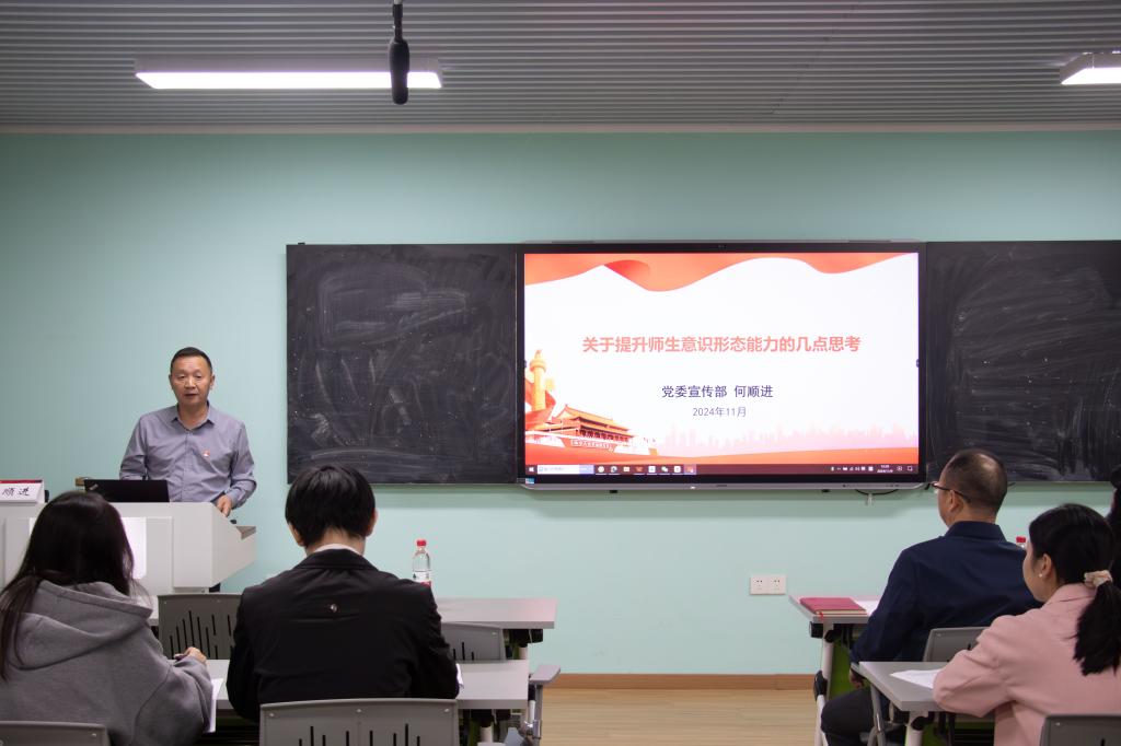 何顺进以“关于提升师生意识形态能力的几点思考”为题,讲授党课第一讲。他从“为什么要重视意识形态能力”“高校意识形态面临什么挑战”“高校师生如何提升意识形态能力”三个方面出发,引导员工领会习近平新时代中国特色社会主义思想,深入理解党的二十届三中全会中关于意识形态的相关论述,辩证讨论意识形态能力在当前国际形势下的重要性。