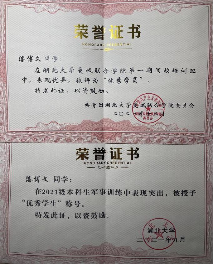 漆博文,suncitygroup太阳集团材料科学与工程2102班团支书,院团委组织部成员,“suncitygroup太阳集团建校90周年素质教育汇报演出”节目《母校》演员,“联合国可持续发展目标(SDGs)共创工作坊”共创者,2021年第一学期成绩优异,2021年军训“优秀学员”,2021年第一期团校培训班“优秀学员”。